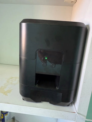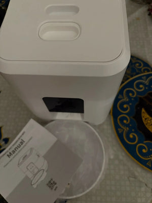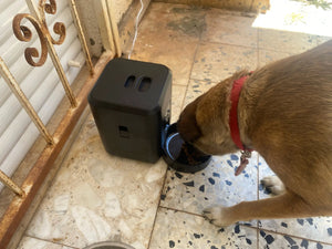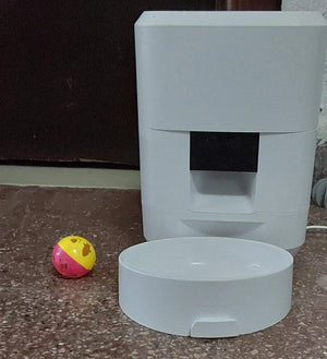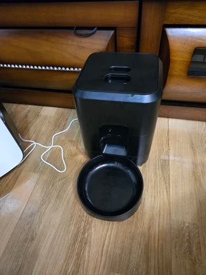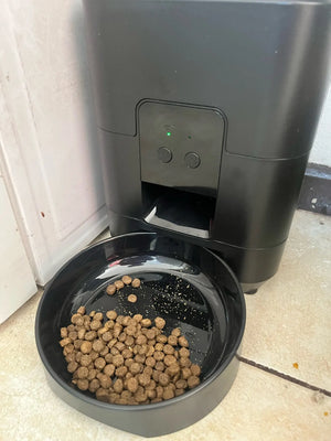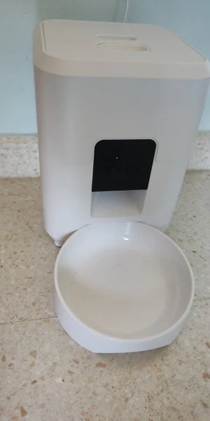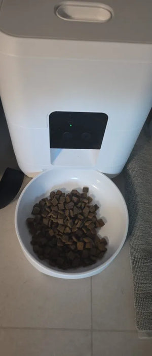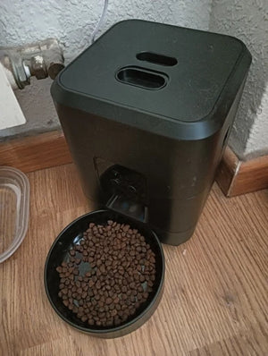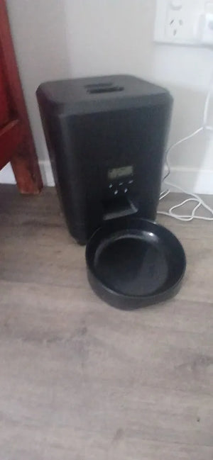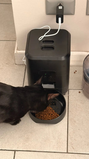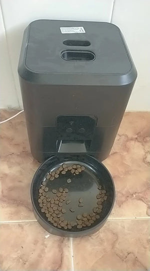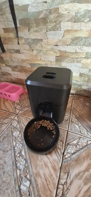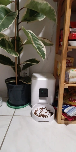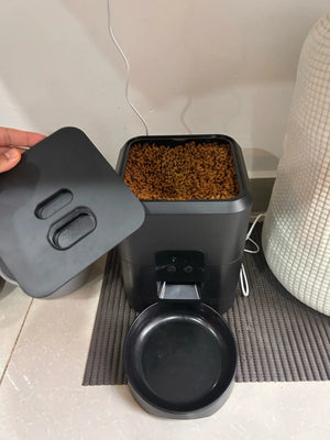 The feeder dispenses meals at scheduled times, ensuring your pet never misses a meal even when you're away.